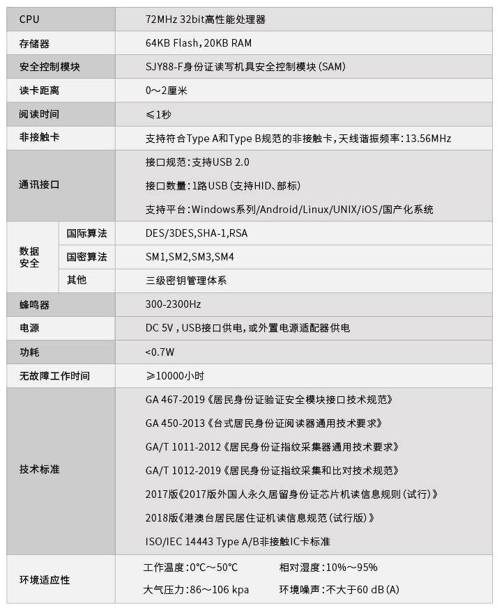 产品内置公安部授权的专用身份证安全控制模块(SAM),符合GA450-2013台式居民身份证阅读器通用技术要求,可读取多种身份证件信息,如中国第二代居民身份证、外国人永久居留身份证、港澳台居民居住证信息的有效性验证和信息的实时读取,并通过通讯口将证件信息上传到计算机进行解码、显示和查询等处理。同时可兼容读写其他行业定制的基于Type A、Type B规范的行业非接触卡(包括但不限于公交卡、员工卡、门禁卡、居民健康卡、景区卡、税务卡等),也可单独作为Type A卡的射频卡读写器使用。